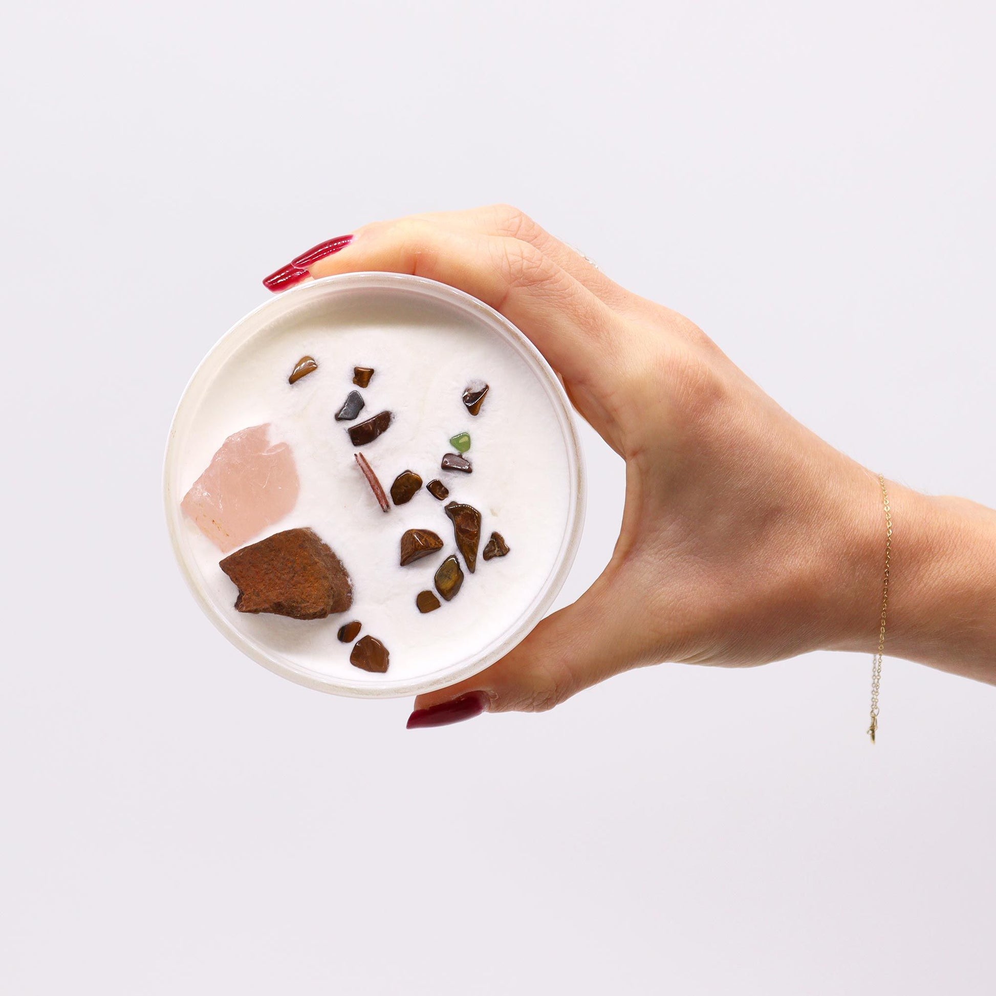 Nuestra vela del chakra sacro está fabricada con piedras preciosas reales, incluyendo ojo de tigre y cuarzo rosa, seleccionadas por sus propiedades energéticas y curativas.