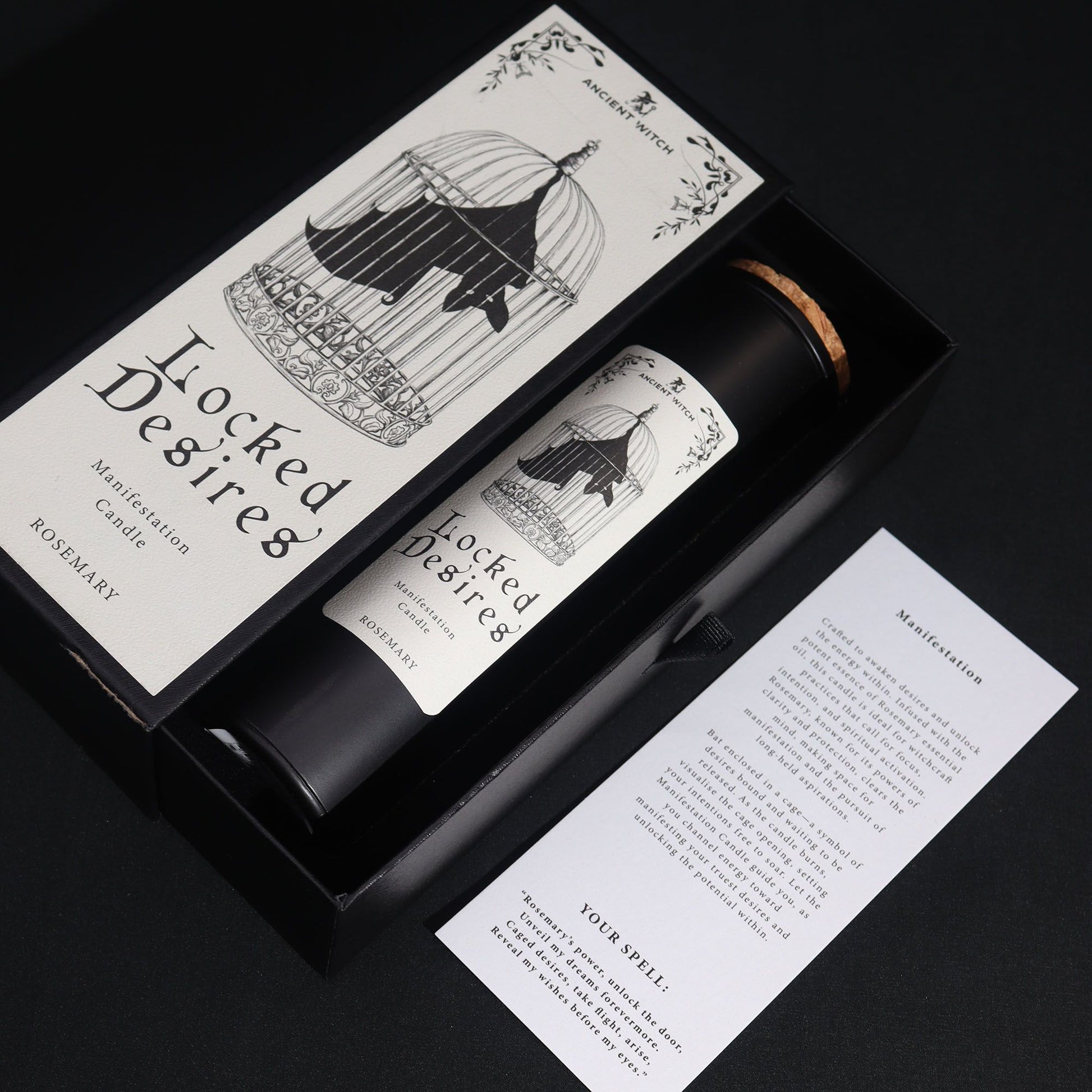 Cada vela se presenta en una elegante caja de regalo e incluye una tarjeta de hechizo ritual.